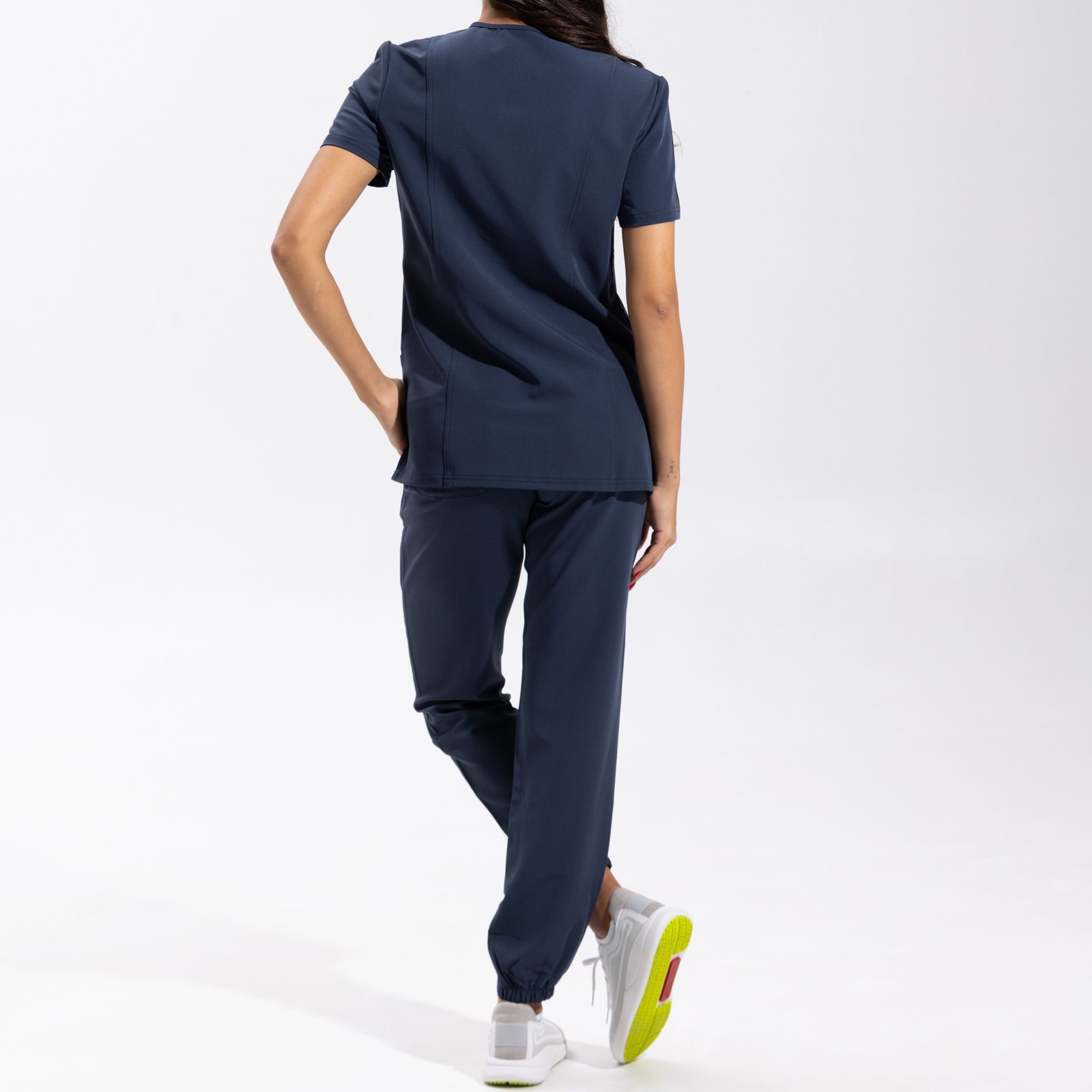 Este uniforme médico incluye una casaca sanitaria femenina tipo top médico cruzado (también conocida como blusa de uniforme) con cinturilla elástica suave y cordón de marca Plum, y un pantalón jogger médico con ajuste perfecto y detalles prácticos.