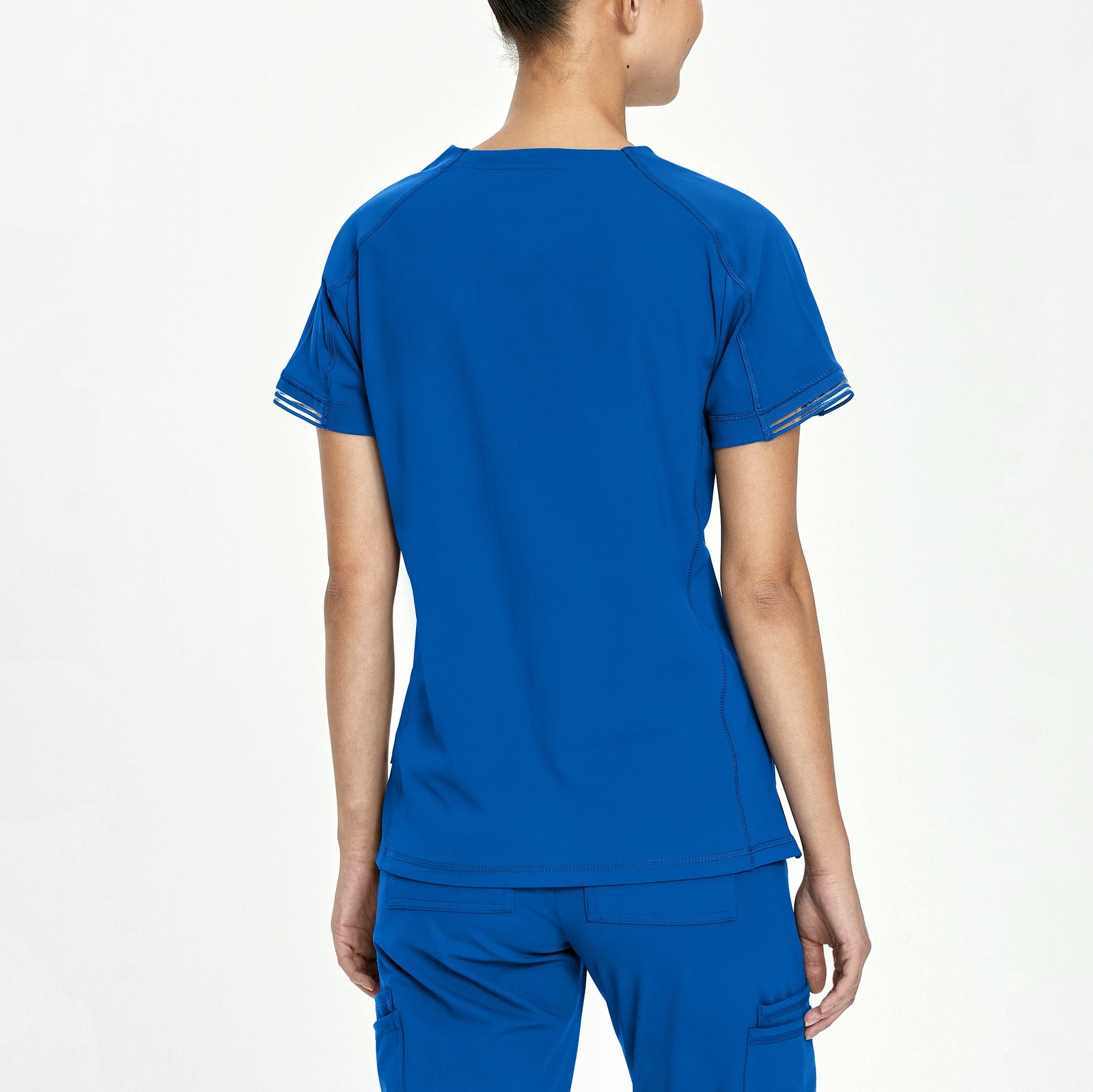 - Moderno escote cruzado en V con ribete de rayas transparentes.