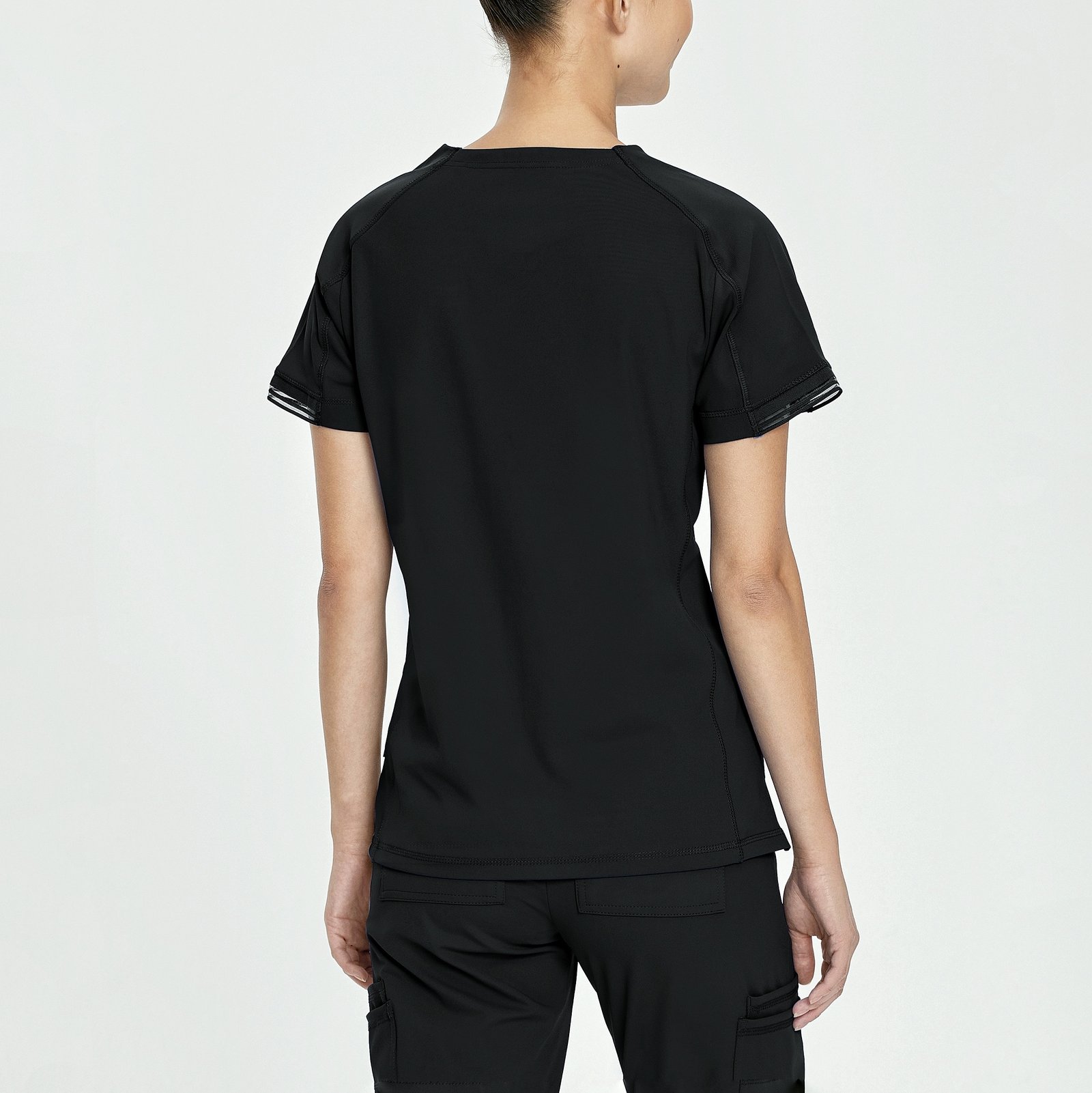 - Moderno escote cruzado en V con ribete de rayas transparentes.
