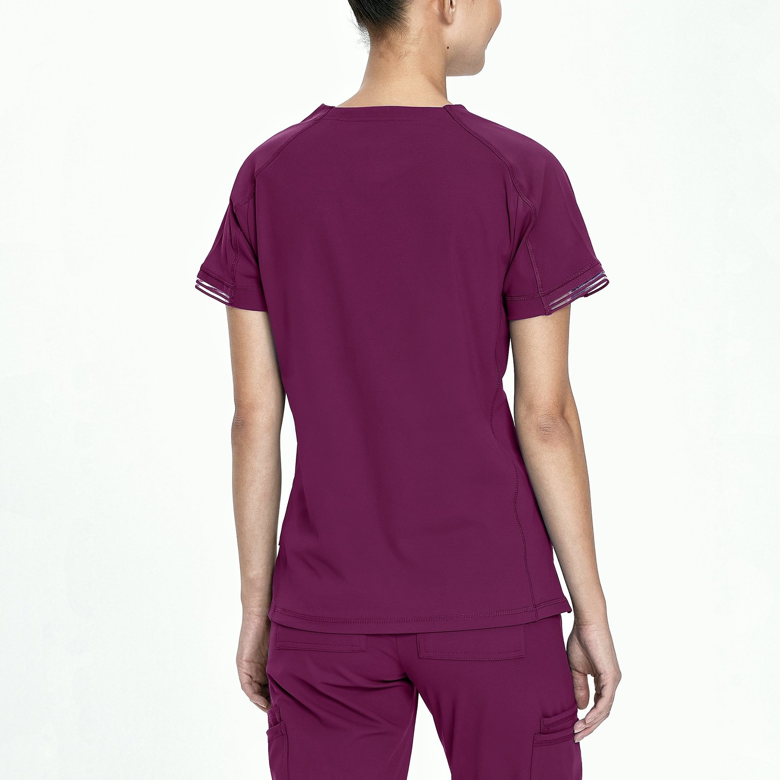 - Moderno escote cruzado en V con ribete de rayas transparentes.
